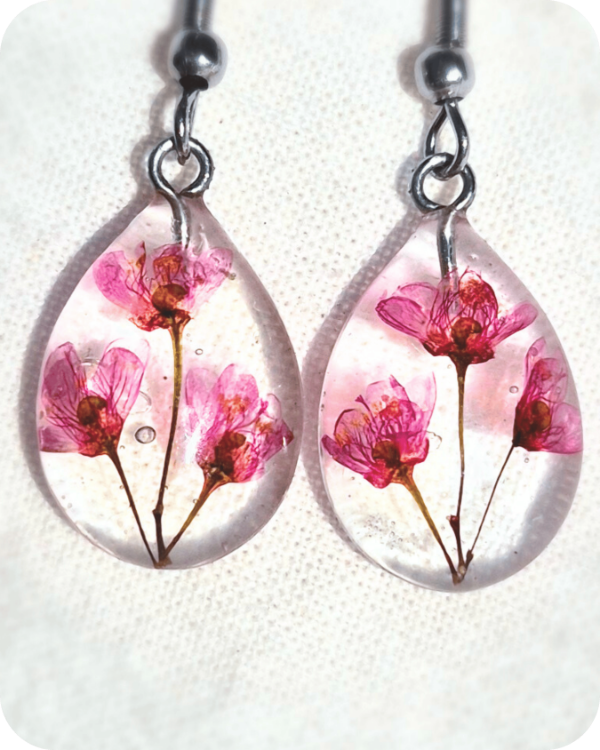 Estos aros albergan una flor real, recolectada a mano con especial cuidado hacia la planta y sus futuras flores.