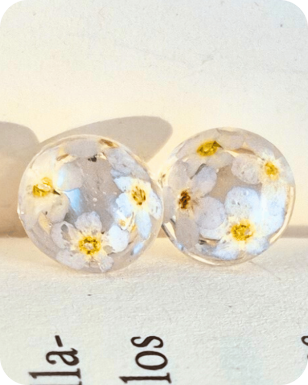 Estos aros albergan una flor real, recolectada a mano con especial cuidado hacia la planta y sus futuras flores.