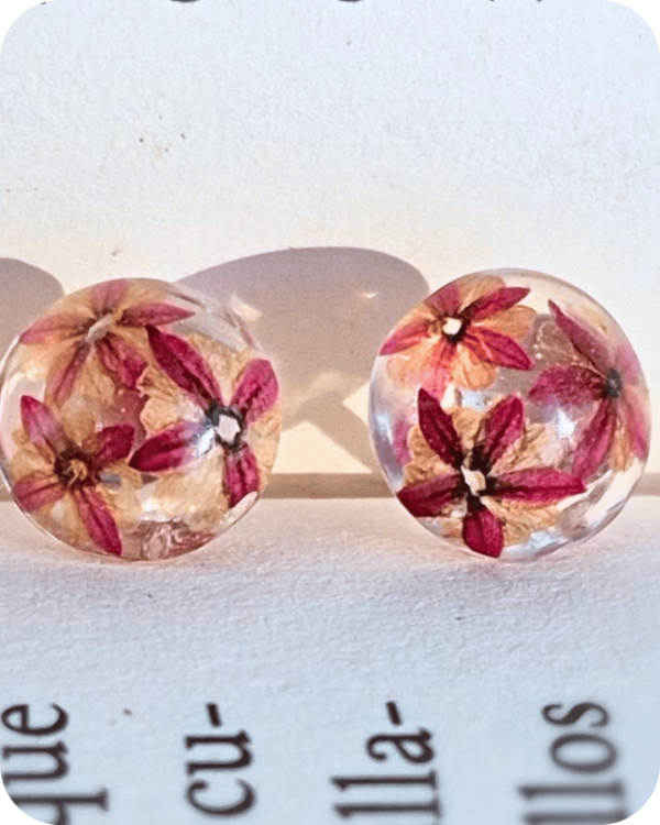 Estos aros albergan una flor real, recolectada a mano con especial cuidado hacia la planta y sus futuras flores.
