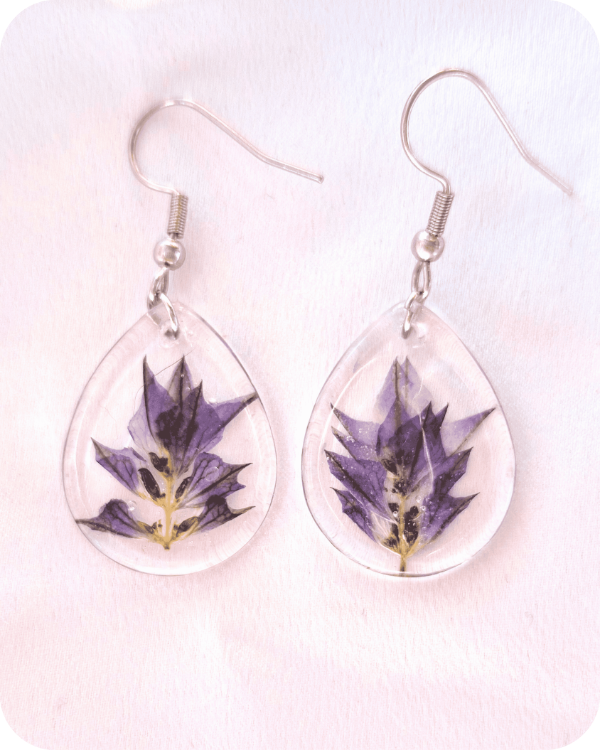 Estos aros albergan una flor real, recolectada a mano con especial cuidado hacia la planta y sus futuras flores.