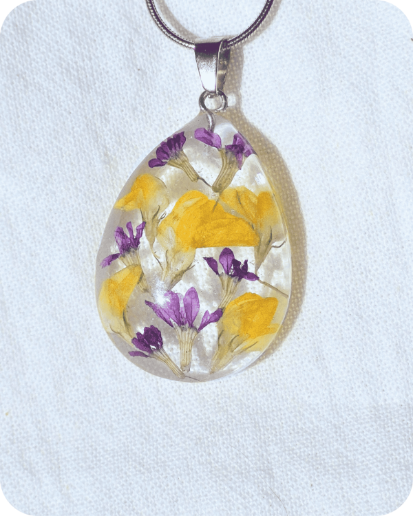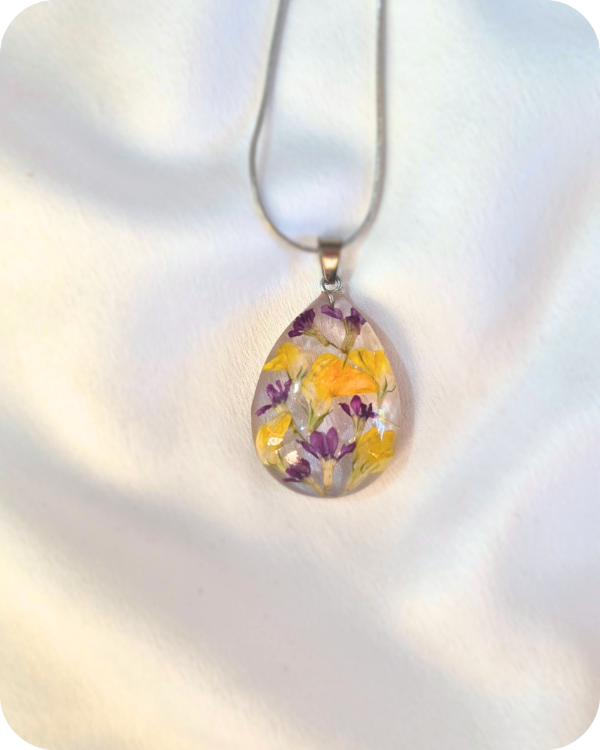 Este dije alberga una flor real, recolectada a mano con especial cuidado hacia la planta y sus futuras flores.
