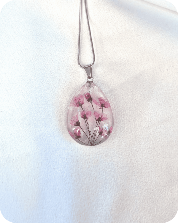 Este dije alberga una flor real, recolectada a mano con especial cuidado hacia la planta y sus futuras flores.