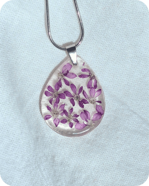 Este dije alberga una flor real, recolectada a mano con especial cuidado hacia la planta y sus futuras flores.