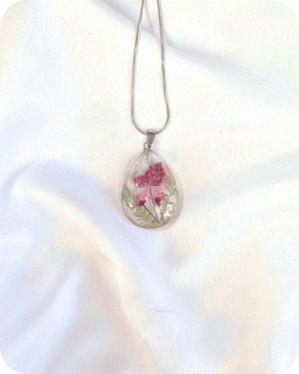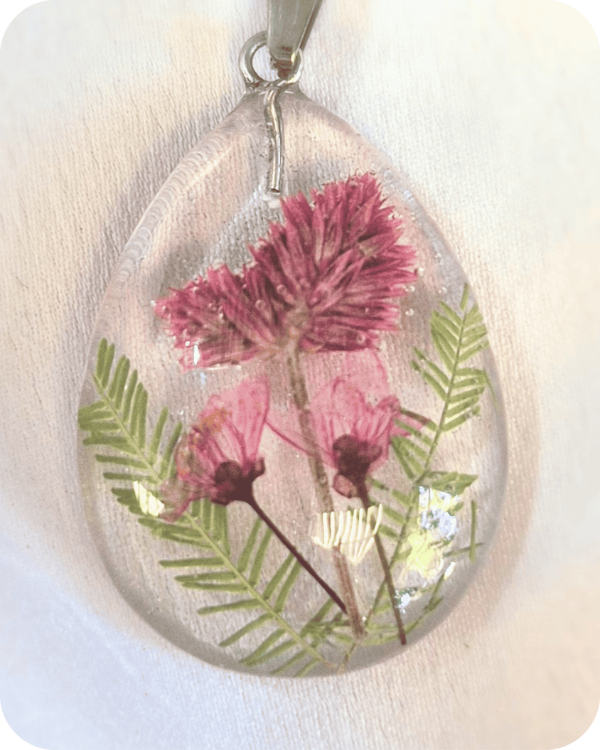 Este dije alberga una flor real, recolectada a mano con especial cuidado hacia la planta y sus futuras flores.