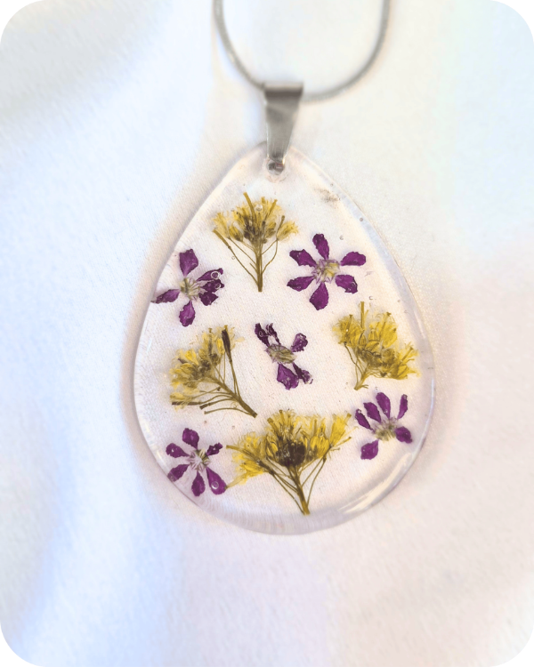 Este dije alberga una flor real, recolectada a mano con especial cuidado hacia la planta y sus futuras flores.