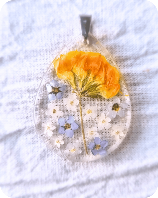 Este dije alberga una flor real, recolectada a mano con especial cuidado hacia la planta y sus futuras flores.